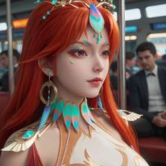 solo,1girl,fair_skin,white_skin,shiny_skin,Ivory_skin,solo focus,(perfect_face:1.2),(perfect_anatomy:1.1),(upper_body:1.2),(portrait:1.1),large breasts,sitting,(train_interior:1.1),(blurry_background:1.2),score_9, <lora:沧元图-柳七月-凤凰Pony:0.6>,long,flowing red hair,a vibrant,flowing skirt adorned with large,colorful,peacock-like feathers in shades of green,blue,and gold,cascading down her right side.,