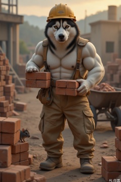 Realistic-style Husky: A chubby yet muscular build (strong shoulders and legs with a slightly rounded belly), standing upright on hind legs in a human-like posture, gripping weathered red bricks with its front paws, and wearing a realistically proportioned hard hat. The fur is finely detailed (black, white, and gray gradients with a dusty texture), and its eyes show focus with a hint of pride. The background is a dusk construction site (piles of bricks, a rusty wheelbarrow), rendered with dusty golden-hour lighting, and a realistic mouse peeking out from the cracks of the bricks. Emphasize anatomical muscle structure, brick and metal textures, and fur lighting contrasts to create a surreal, absurd laborer atmosphere."