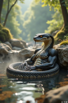 A realistic humanoid snake relaxing in a hot spring: A muscular, humanoid snake with a serpentine lower body and a human-like torso, coiled comfortably in a natural hot spring. Its upper body has defined muscles and smooth, iridescent scales, while its face retains snake-like features (slit pupils, forked tongue) but with a humanized expression of relaxation. The steam rises gently around its body, and the water reflects the warm tones of the surrounding rocks and vegetation. The background features a serene forest setting, with moss-covered rocks, distant trees, and soft sunlight filtering through the mist. Focus on realistic anatomy, scale texture, water and steam effects, and the tranquil atmosphere of the hot spring.