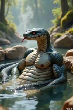 A realistic humanoid snake relaxing in a hot spring: A muscular, humanoid snake with a serpentine lower body and a human-like torso, coiled comfortably in a natural hot spring. Its upper body has defined muscles and smooth, iridescent scales, while its face retains snake-like features (slit pupils, forked tongue) but with a humanized expression of relaxation. The steam rises gently around its body, and the water reflects the warm tones of the surrounding rocks and vegetation. The background features a serene forest setting, with moss-covered rocks, distant trees, and soft sunlight filtering through the mist. Focus on realistic anatomy, scale texture, water and steam effects, and the tranquil atmosphere of the hot spring.