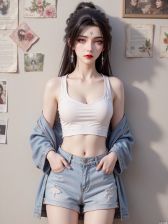 The main body of the picture is a woman. She has long black hair, tied into a loose hairstyle, has a beautiful face and elegant makeup. She wore a white sports vest on the upper body, a light blue denim jacket on the outside, and light blue denim shorts on the lower body, making the overall look casual and fashionable.