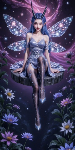 真人肌肤纹理, 4K画质,完美身材,1girl,looking_at_viewer,huge_breasts,,long legs,realistic,A captivating fantasy elf portrait set in a surreal, floating garden in the sky. The elf, with iridescent, translucent wings like those of a dragonfly, sits gracefully on a floating crystal lily pad. Her flowing hair shimmers with every color of the rainbow and cascades down, merging with the floating flora around her. Her eyes are deep pools of starlight, and her delicate, silver gown is adorned with tiny, twinkling constellations. The garden is filled with glowing, bioluminescent flowers and whimsical, hovering orbs of light. The backdrop features a swirling nebula sky with vibrant hues of pink and purple, creating a dreamlike, cosmic atmosphere. The portrait combines elements of ethereal beauty and celestial wonder, blending fantasy with a touch of otherworldly magic.,high_heel,, argyle legwear,star \(symbol\,aorun, blue hair,pointy ears,red eyes,horns
