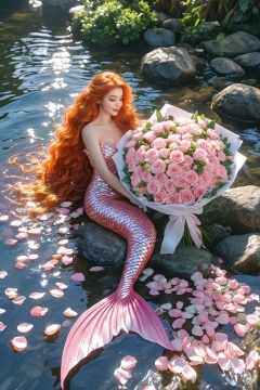 kinghere mryhh,1girl,solo,pink mermaid,long hair,looking at viewer,smile,holding,bare shoulders,sitting,flower,red hair,outdoors,water,orange hair,petals,rose,leaf,wavy hair,pink flower,curly hair,rock,bouquet,holding flower,scales,mermaid,head fins,pink rose,holding bouquet,fins,,<lora:kinghere mryhh xl:0.8>, cinematicstunning contrasts and shadow,introspection,8k,Photography,super detailed,hyper realistic,masterpiece,Depth of field,bright color,Super lightsensation,caustic,