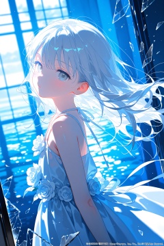 masterpiece,best quality,high quality,loli,Light Blue Theme,//,1girl,solo,long hair,dress,looking at viewer,white eyes,glass,grey eyes,white dress,white hair,flower,broken glass,white theme,bare shoulders,blue theme,dress flower,glass shards,white flower,water,parted lips,closed mouth,sleeveless,reflection,sleeveless dress,watermark,white rose,expressionless,//,year_2023,year_2024,//,official art,depth of field,detailed light,blurry background,cinematic lighting,ray tracing,amazing quality,very aesthetic,absurdres,beast quality,ultra detailed,god rays,backlighting,photo background,film grain,chromatic aberration,volumetric lighting,depth of field,blurry background,shiny skin,floating hair,cinematic lighting,day,very aesthetic,
