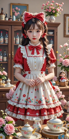 The girl in the picture is wearing a red and white Lolita-style outfit with a big red bow hair accessories. The background is a cupboard filled with bottles, decorative paintings and flowers, and tea sets, dolls, etc. on the table. The Lolita style combines a variety of fashion elements, often creating a sweet and dreamy atmosphere.