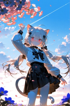 masterpiece,best quality,high quality,loli,konya,1girl skirt cat solo shirt animal ears outdoors long hair white shirt sky hair ornament cloud red eyes day black skirt long sleeves bangs twintails x hair ornament white pantyhose animal ear fluff blush bow cat ears blue sky pantyhose sailor collar very long hair closed mouth black sailor collar black bow hand up white hair high-waist skirt hair between eyes blurry foreground sitting collar cat girl petals animal bowtie black collar white cat flower low twintails looking at viewer grey hair floating hair cloudy sky feet out of frame pleated skirt blurry tail black bowtie wind small breasts cat hair ornament parted lips puffy long sleeves cat tail school uniform choker depth of field breasts from below hair bow contrail looking away suspender skirt puffy sleeves serafuku looking at animal buttons ahoge arm up mutated hands poorly drawn hands mutated hand and finger fused fingers too many fingers missing fingers