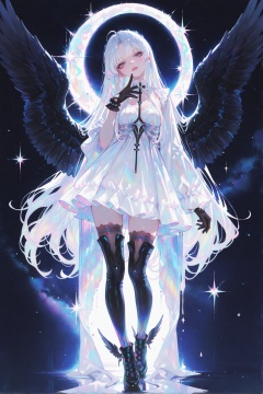 very awa,<lora:748cmSDXL:0.3>,748cmstyle,<lora:748cm-NoobEPS100-lokr-v03-000080:0.6>,748cm,<lora:ponyv6_noobV1_2_adamW-000017:0.35>,(taro-k:0.5),(opossumachine:0.3),(maccha \mochancc\:0.25),<lora:noobai_ep11_stabilizer_v0.114_fp16:0.4>,<lora:XXX667:0.5>,xxx667_illu,1girl,feathered wings,large wings,black wings,looking at viewer,head tilt,multicolored background,starry sky,hdr,pastel colors,iridescent,no lineart,realistic,masterpiece,[best quality:0.25],newest,absurdres,very aesthetic,best quality,year 2024,newest,<lora:Carlotta-ill-Tanger:0.8>,Carlotta,Carlotta def white dress,1girl,thighhighs,long silver hair,black footwear,black gloves,