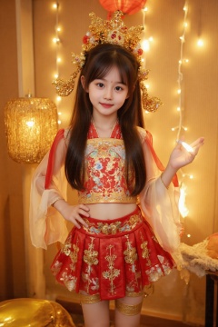 tyz,A 6-year-old girl with long black and smooth hair stood in the corner of a room with warm lights. She was wearing the traditional God of Wealth costume,and a red mini skirt embroidered with golden patterns fluttered gently with her movements. Her thighs were tied with golden straps,adding a touch of luxury. A bright smile bloomed on his face,conveying a festive atmosphere. She was tall and straight,with one hand on her hip and the other slightly raised,as if she was sending blessings to the people in the room. The camera shot at a 45-degree angle,bringing her whole body into the lens,and the light shines behind her,creating a warm and shiny effect. There are several decorative lanterns in the background,further creating a festive atmosphere.,
