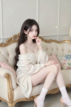 Best Quality,Masterpiece,1girl,bare shoulders,black hair,earrings,feet,finger to mouth,jewelry,kneehighs,lips,sweater,Pressing one leg onto the other leg,White Stockings,Girl's posture,long hair,looking at viewer,no shoes,off shoulder,pillow,sitting,socks,solo,sofa,full body,