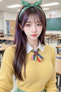 Masterpiece, the best quality, high quality, (colorful) , big breasts,,(purple hair:1.4),(long legs:1.3), 1girl,brown hair,long hair,yellow eyes,large breasts,bow hairband,green bow,hairclip,x hair ornament,yellow sweater,wool sweater,heavy sweater,fluffy sweater,closed sweater,white undershirt,green skirt,white collar,black ribbon tie,long skirt,full-length skirt,covered legs,multicolored ribbon,striped stockings,classroom,focus on face,selfie,from above,