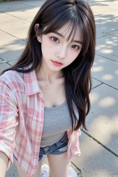 Masterpiece, the best quality, high quality, (colorful) , big breasts,,(black hair:1.4),(long legs:1.3),Masterpiece, the best quality, high quality, (colorful) , big breasts,,(long legs:1.3),This is a photograph of a young Asian woman taking a selfie outdoors. She has fair skin, long straight brown hair with bangs, and is wearing light makeup with pink lipstick. She is dressed casually in a gray t-shirt, denim shorts, and white sneakers. Over her t-shirt, she wears an unbuttoned pink and white plaid shirt. She has a pendant necklace with a small pendant. The background shows a concrete pavement with shadows, indicating natural lighting. The image is well-lit with bright sunlight, casting clear shadows.