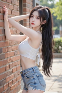 A captivating beauty, with sun-kissed skin and flowing raven-black hair, leans gracefully against a rustic brick wall. She's donning a white, backless **** top that clings to her exceptionally slender waist, revealing a hint of her smooth back. The top is paired with form-fitting denim hot shorts that accentuate her long, toned legs. Her posture, with one leg slightly bent and her arms reaching upwards to touch the wall, exudes a sense of casual elegance. Her head is turned slightly, casting a mysterious glance over her shoulder, lips painted a soft shade of coral.