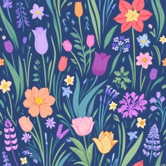 HWTA, A seamless, vibrant botanical pattern featuring a variety of flowers and foliage on a dark blue background. The flowers include pink and red tulips, purple and yellow daffodils, and orange and pink peonies. There are also ferns, lavender, and various other plants. The illustration is done in a whimsical, hand-drawn style with intricate details and rich colors. The pattern is symmetrical and evenly spaced, creating a balanced and harmonious design.