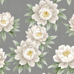HWTA, Digital artwork of a seamless floral pattern featuring large white peonies with soft, light brown centers, surrounded by smaller buds and green leaves. The background is a muted gray with a subtle, textured fabric-like appearance. The flowers have a delicate, watercolor style, with soft shading and gentle gradients. The overall aesthetic is elegant and classic, with a focus on natural beauty and simplicity. The design is symmetrical and balanced, with a repeating motif that creates a cohesive and harmonious visual experience.