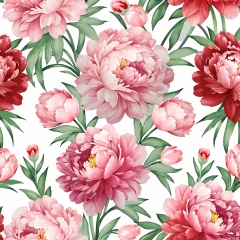 HWTA, A digital painting of a seamless floral pattern featuring large, detailed peonies in shades of pink, white, and red. The flowers are surrounded by lush green leaves, and the background is a clean, white canvas. The style is realistic with a soft, watercolor-like texture. The peonies are arranged in a random, organic manner, creating a visually appealing and balanced composition. The flowers are in various stages of bloom, adding depth and interest to the design. The overall aesthetic is elegant and timeless, suitable for use in decorative prints, wallpaper, or fabric design
