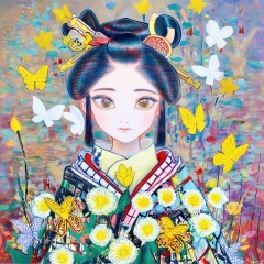 1girl, solo, looking at viewer, black hair, hair ornament, upper body, flower, japanese clothes, kimono, traditional media, bug, white flower, butterfly, multicolored eyes, yellow flower, hair stick