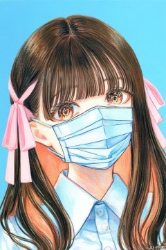 1girl, solo, long hair, looking at viewer, bangs, brown hair, shirt, black hair, ribbon, hair ribbon, upper body, collared shirt, mask, blue background, traditional media, portrait, pink ribbon, colored inner hair, mouth mask, surgical mask, white mask