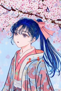 1girl, solo, long hair, black hair, ribbon, blue hair, hair ribbon, upper body, ponytail, flower, parted lips, japanese clothes, kimono, floral print, white flower, cherry blossoms, pink flower, branch