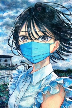 1girl, solo, looking at viewer, short hair, bangs, shirt, black hair, hair between eyes, white shirt, upper body, outdoors, frills, sky, sleeveless, collared shirt, cloud, sleeveless shirt, mask, floating hair, traditional media, cloudy sky, wind, building, mouth mask