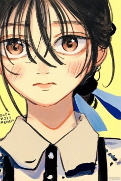 Rock painting,1girl, solo, looking at viewer, blush, bangs, simple background, shirt, black hair, ribbon, hair between eyes, brown eyes, hair ribbon, collared shirt, dated, shadow, portrait, yellow background