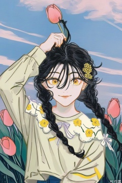 Rock painting 1girl solo long hair looking at viewer smile shirt black hair long sleeves holding hair between eyes yellow eyes upper body braid flower outdoors cloud arm up twin braids pink flower yellow flower holding flower tulip