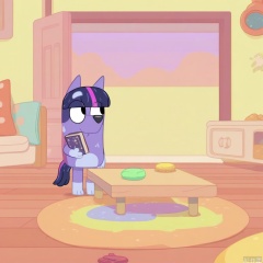 A Bluey-style Twilight Sparkle, wide shot, playful cartoon rendering, vibrant colors, set in an open living room with soft afternoon lighting. Twilight poses cheerfully, her body tilted slightly forward, holding a book in one hoof while gazing curiously at the camera. The background features warm wooden floors, colorful cushions, and scattered toys, creating a cozy atmosphere. Simple lines define her form, capturing Bluey’s whimsical art style with rounded shapes and exaggerated proportions. Keywords: cartoonish, cheerful, indoor scene, pony character, animated, pastel tones.