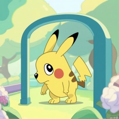 A Bluey-style Pikachu, framed in a close-up against a bright, sunny Australian park background. Soft natural lighting highlights Pikachu’s round cheeks and curious eyes, capturing its playful spirit. Pikachu is crouched playfully, ears perked up, tail curled playfully, exuding energetic curiosity. The composition focuses on casual, friendly vibes with scattered flowers and toys around. Keywords: Bluey, Pikachu, sunny park, soft lighting, playful pose, curious expression, energetic charm, Australian setting.