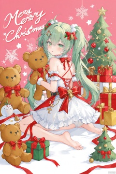 Girl as Santa, Kneeling, Christmas gifts, Green hair, Two ponytails, Red bows, Open back dress, White underwear, Festive background, Stars, Bells, Wreath, Teddy bear, Merry Christmas!,woman dressed as Santa, surrounded by gifts, sits on knees, Christmas decorations, gifts, stars, pink background, Christmas decorations, green hair,festive anime character, Santa theme outfit, teddy bear, Merry Christmas text, wreath