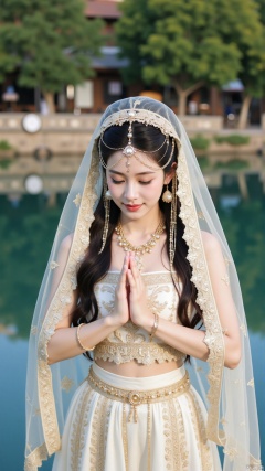 The image is a portrait of a young woman wearing a traditional Indian wedding outfit. She is standing in front of a body of water with trees and buildings in the background. The woman is wearing a white saree with intricate gold embroidery and a matching blouse. She has long dark hair styled in loose waves and is adorned with a gold headpiece with intricate designs. Her eyes are closed and her hands are clasped together in a prayer-like gesture. The overall mood of the image is peaceful and serene.