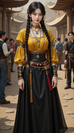 The imelegant and sophisticated.age is a digital illustration of a young woman dressed in traditional Chinese clothing. She is standing in a courtyard with a group of people in the background. The woman is wearing a long black dress with a yellow top and a black skirt. She has long black braided hair styled in two braids and is accessorized with a gold necklace and earrings. Her hair is styled in a half-up, half-down braid with a blue gemstone in the center. She also has a gold belt with gold accents and a red tassel hanging from it. The overall style of the outfit is