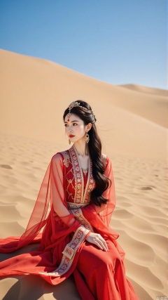 The image is a portrait of a young woman sitting on a sand dune. She is wearing a traditional red dress with gold embroidery and a gold headpiece. Her long black hair is styled in loose waves and she is looking off to the side with a serious expression on her face. The background is a clear blue sky and the sand dunes stretch out in all directions. The overall mood of the image is peaceful and serene.