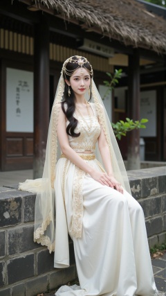 The image is a portrait of a young woman wearing a traditional Chinese wedding dress. She is sitting on a stone ledge with a thatched roof in the background. The woman is wearing a long white dress with intricate gold embroidery and a long veil that cascades over her shoulders. Her hair is styled in loose waves and she is wearing gold earrings and a headpiece with a floral design. She has a serious expression on her face and is looking directly at the camera. The overall mood of the image is elegant and romantic.