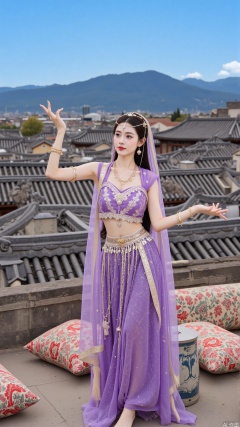 The image shows a young woman standing on a rooftop with a beautiful view of a city and mountains in the background. She is wearing a traditional Chinese outfit, which is a purple and gold lehenga with intricate embroidery and a matching dupatta draped over her shoulders. The woman has long dark hair styled in loose waves and is wearing gold jewelry and earrings. She has her arms stretched out to the sides and her hands are clasped together in front of her. The rooftop is covered in traditional Chinese tiles and there are several colorful pillows scattered around. The sky is blue and the overall mood of the image is peaceful and serene.
