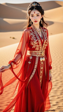 The image is a portrait of a young woman wearing a traditional Chinese outfit. She is standing in a desert-like setting with sand dunes in the background. The woman is wearing a long, flowing red dress with intricate gold embroidery and embellishments. The dress has a high neckline and long sleeves, and the skirt is flowing in the wind. She has long dark hair styled in loose waves and is wearing gold earrings and a headpiece with a floral design. Her makeup is dramatic and dramatic, with dark eyeliner and red lipstick. The overall mood of the image is elegant and regal.