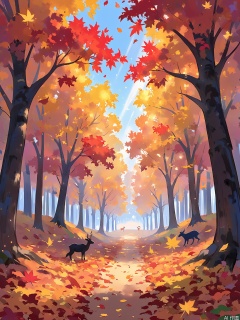LCCH, A luminous autumn forest with trees ablaze in shades of red, orange, and yellow. Leaves crunch underfoot, and a crisp breeze blows through the air. Animals forage for food, preparing for the winter ahead. The style is nostalgic and peaceful.