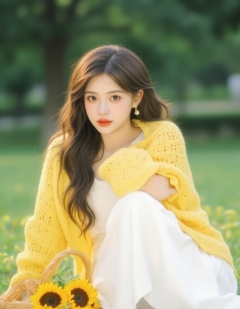 <lora:发丝发光:1>,The image is a portrait of a young woman sitting on a grassy field with a basket of sunflowers in front of her. She is wearing a white dress with a yellow shawl draped over her shoulders. Her long dark hair is styled in loose waves and she is looking directly at the camera with a serious expression. The background is blurred, but it appears to be a park or garden with trees and greenery. The overall mood of the image is peaceful and serene.The light came from behind her, through her hair, and it looked as if it was glowing.