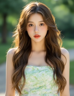 <lora:发丝发光:1>,The image is a portrait of a young woman with long, wavy hair. She is wearing a strapless dress with a green and white floral pattern. Her hair is styled in loose waves and falls over her shoulders. She has a serious expression on her face and is looking directly at the camera. The background is blurred, but it appears to be an outdoor setting with trees and greenery. The lighting is soft and natural, creating a dreamy and ethereal atmosphere..The light came from behind her, through her hair, and it looked as if it was glowing.