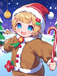 KAF, An adorable anime-style illustration of a boy with short, blond hair, wearing a cozy, gingerbread house costume with candy cane accents and a gumdrop button. The costume is made of soft, brown fabric with colorful, edible decorations. He has cheerful, festive eyes and a wide, excited grin. The background is a snowy, winter wonderland, with twinkling lights and decorated trees.