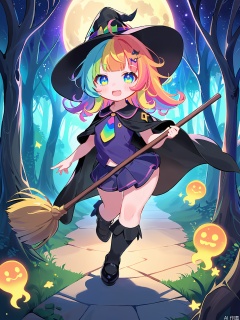 KAF, A charming anime-style drawing of a girl with curly, rainbow-colored hair, dressed in a magical, witch costume with a pointed hat, broom, and flowing, black cape. The costume is adorned with mystical symbols and sparkling, starry accents. She has wise, mysterious eyes and a confident, empowered expression. The backdrop is a moonlit forest, with spooky trees and glowing, will-o'-the-wisps.