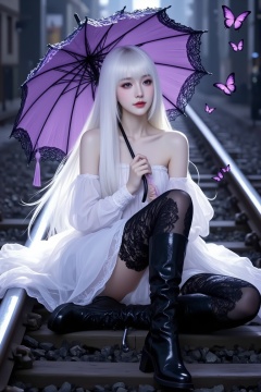 <lora:YY-拽姐F.1:1>,This is a highly detailed digital illustration featuring a young woman sitting on a railway track. She has long,straight,platinum blonde hair and pale skin. She is wearing a voluminous,off-the-shoulder white dress with intricate lace detailing,which falls to her feet. Her attire also includes black,thigh-high lace stockings and shiny,black,high-heeled boots with intricate lace patterns. She holds a large,purple parasol with intricate lace trim,which is held up by a slender black handle. The parasol is adorned with a small,purple tassel.,The woman's expression is calm and slightly melancholic,with a delicate,pink blush on her cheeks. She is sitting on a railway track,with the rails and ties visible behind her,and a blurred background suggesting a train station or a cityscape. Three small,purple butterflies are flying in the air,adding a whimsical touch to the scene. The illustration is rendered in a realistic,semi-realistic style,with a focus on detailed textures and shading,giving it a photorealistic quality. The overall mood is a blend of elegance and melancholy,with a hint of mystery.,
