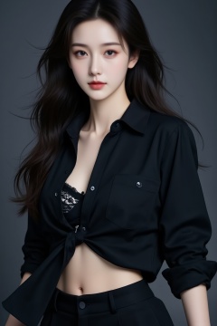 <lora:YY-拽姐F.1:1>,An Asian woman is wearing a black shirt with two buttons undone,revealing a lace bra. She has long hair and is wearing a hip hugging skirt on her lower body,