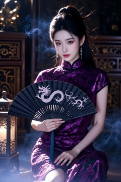 <lora:YY-拽姐F.1:1>,a young woman with delicate features and fair skin, seated on a wooden floor. She is dressed in a traditional Chinese cheongsam, a form-fitting, high-necked dress made of luxurious purple silk with intricate gold embroidery. Her hair is styled in a high, sleek ponytail, and she wears minimal makeup with a soft pink lipstick. She holds a black, dragon-patterned fan in her right hand, which she gently closes and opens, adding a graceful touch to her pose. The room's atmosphere is mystical and ethereal, with a faint blue mist swirling around her, suggesting a magical or otherworldly setting. The background features dark wooden furniture with ornate carvings, and a small lantern emitting a soft, warm glow, casting a warm light on her face. The overall aesthetic is a blend of traditional Chinese elegance and fantasy, with the woman exuding a serene, almost ethereal presence.