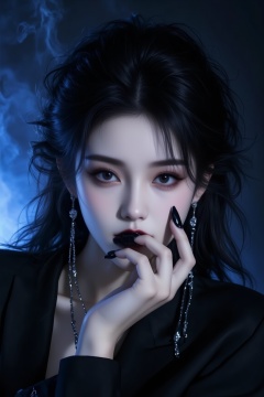 <lora:YY-拽姐F.1:1>,a young woman with a striking,gothic aesthetic. The subject has a pale complexion and large,expressive eyes with dark,dramatic makeup that accentuates her eyes and lips. Her lips are painted a glossy black,and her eyelids are lined in dark shades,giving her a sultry,intense gaze. Her hair is jet black and tousled,partially covering her face,and she has a delicate,slender hand with long,black,glossy nails,which she holds delicately in front of her face. The background is a deep,dark blue,adding to the mysterious and moody atmosphere. The overall effect is one of elegance and edginess,with a focus on the subject's striking features and the contrast of her pale skin against the dark surroundings. The texture of the image is smooth and realistic,with fine details on the makeup and skin,and a sense of depth created by the lighting. The artwork captures the essence of a dark,avant-garde beauty.,