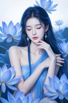 <lora:YY-拽姐F.1:1>,This is a highly detailed, digital illustration featuring a serene young woman with a delicate, ethereal quality. She is depicted with long, flowing blue hair that cascades down to her waist, blending seamlessly with the large, blue lotus flowers surrounding her. Her eyes are closed, and her facial expression is one of serenity and peace. She is nude, with her breasts partially covered by the lotus petals, adding a subtle sense of modesty.The woman's skin tone is pale, and her delicate features, such as her small nose and delicate jawline, are accentuated by the minimalistic shading. Her hands are positioned gently near her face, with one hand touching her chin and the other resting near her neck. The background is a soft, off-white color, which contrasts beautifully with the cool blue hues of the lotus flowers and the woman's hair. The lotus petals are intricately detailed, with their veins and textures rendered with precision, giving a sense of depth and realism. The overall style of the artwork is a blend of realism and fantasy, with a touch of traditional Asian aesthetics, particularly in the lotus flower design.
