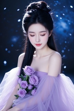 <lora:YY-拽姐F.1:1>, a young Asian woman with a delicate, ethereal aesthetic. She has a fair complexion and long, straight, jet-black hair styled in an intricate updo with loose strands framing her face. Her eyes are almond-shaped and a striking shade of deep brown, accentuated with subtle makeup. She wears a sleeveless, off-the-shoulder gown made of sheer, lavender tulle, which flows gracefully around her, creating a dreamy, almost ethereal effect. The dress is adorned with a bouquet of lavender roses, which she holds delicately in her right hand. She has a serene, almost meditative expression on her face, with her left hand resting gently on her lap.The background is a deep blue, with a galaxy-like effect, featuring soft, out-of-focus white bokeh lights that add to the dreamy ambiance. The overall mood is one of tranquility and elegance, enhanced by the soft lighting and the delicate, dreamy textures of her dress and the flowers. The photograph exudes a sense of timeless beauty and serenity, blending elements of fantasy and romance.