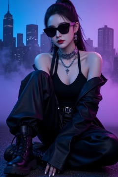 <lora:YY-拽姐F.1:1>,a young woman with a striking appearance and an edgy, gothic style. She is seated on the ground, legs crossed, with a dramatic pose that draws attention to her confident and rebellious demeanor. Her skin is fair, with a slight tan, and her dark hair is styled in a sleek, high ponytail. She wears large, black, square-shaped sunglasses that cover most of her face, adding a mysterious touch to her look. Her lips are painted in a bold, dark red lipstick, complementing her overall dark and bold aesthetic.She is dressed in a black leather jacket, worn off the shoulders, revealing a black, sleeveless top underneath. A chunky choker and multiple silver necklaces adorn her neck, adding to her punk-rock vibe. Her outfit is completed with black leather pants and combat boots, which exude a rugged, street style. The background features a cityscape silhouette of skyscrapers in shades of blue and purple, adding an urban, futuristic feel to the scene. The ground is a dark, rough texture, possibly concrete, and a layer of mist or smoke hovers around her, enhancing the moody, otherworldly atmosphere. The overall composition and lighting create a striking contrast between the dark, edgy elements