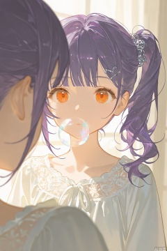 zhizi (Singularity age),1girl,solo,orange eyes,hair ornament,bangs,purple hair,long hair,front view,bust,Side ponytail,blunt bangs,blouse,dress,bubble_blowing,eye-contact,expressionless,