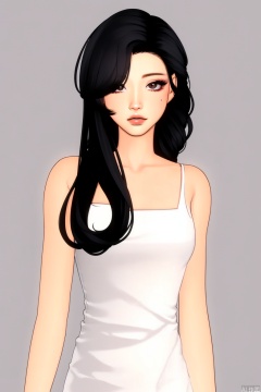 1girl, solo, black hair, dress, long hair, white dress, lips,Toot lips, simple background, looking at viewer, white background, brown eyes