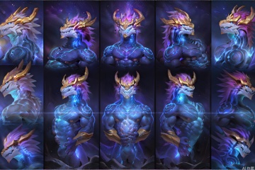 solo,  only the head, 1boy, character:AurelionSol, golden circular heavy pupils, white hair, male focus, horns, blue  eyes, muscular, thick eyebrows, pectorals, muscular male, bara, furry, wading, large pectorals, furry male,  Multiple perspectives, dragon boy