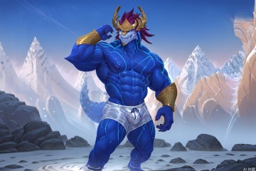 solo, looking at viewer, smile, 1boy, navel, animal ears, nipples, tail, male focus, medium hair, water, stomach, muscular, abs, pectorals, muscular male, goggles, bara, furry, large pectorals, bulge, topless male, furry male, white fur, male swimwear, navel hair, swim trunks, swim briefs, dragon boy,dragon furry,character:AurelionSol